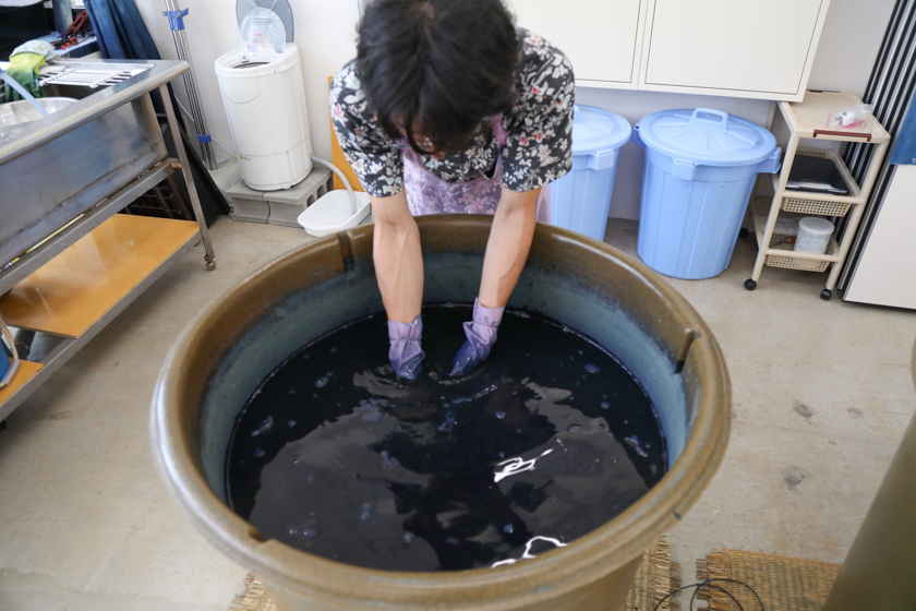 染液に漬けて、空気にさらす工程を繰り返すことで色を濃くしていくんですよ〜