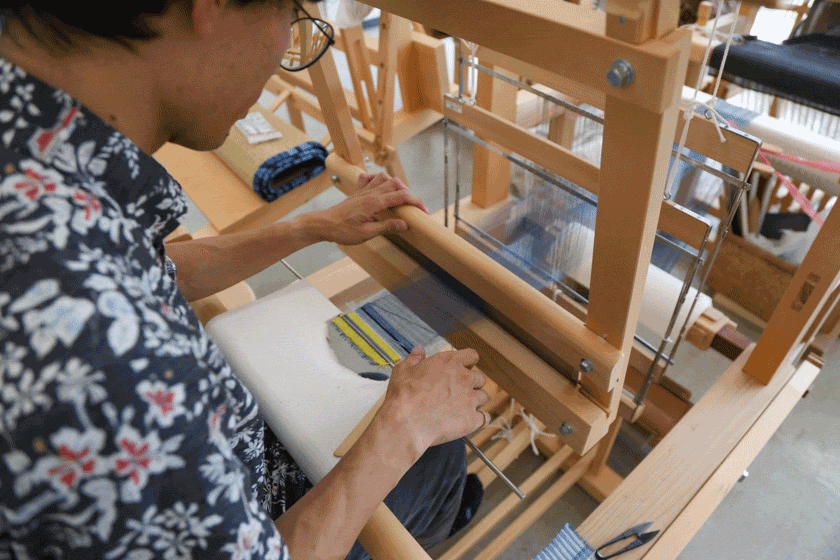 糸を選んだら早速開始!タテ糸が上下交互に手元まで伸びており、その間にヨコ糸を通し、