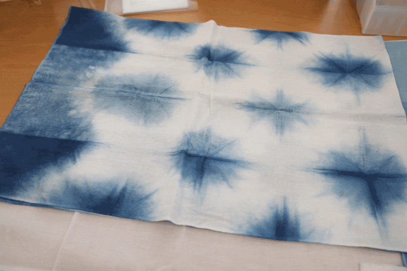藍染のサンプルを見たりしながら、どんな模様になるか想像して形をつくるよ〜