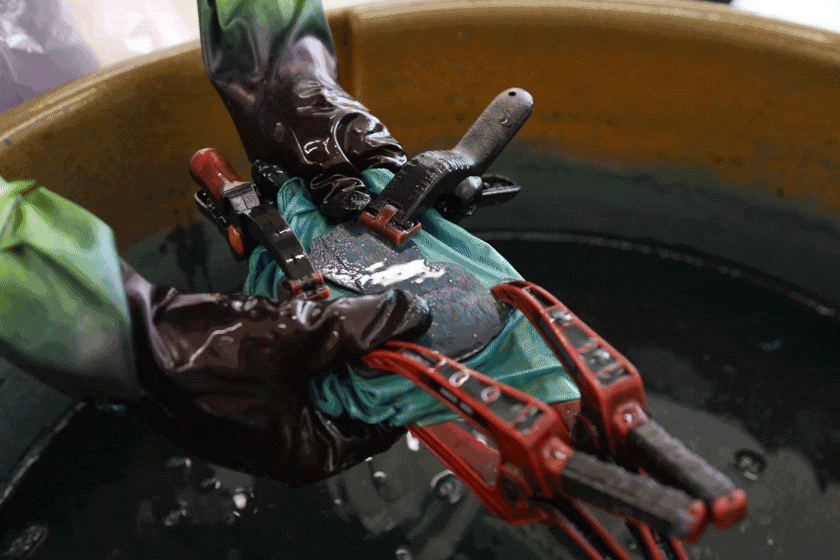 染める形を作れたら藍染液の中に生地を漬けて、色素が浸透するように2分間揉み込みます。