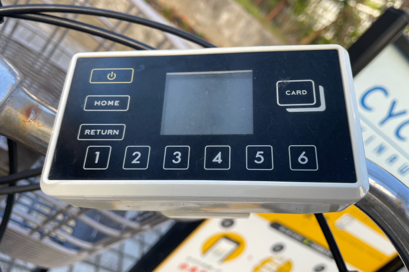 コチラの白いロックの自転車はアプリに表示される暗証番号を自転車備え付けの機器に入力するとロックが外れます。