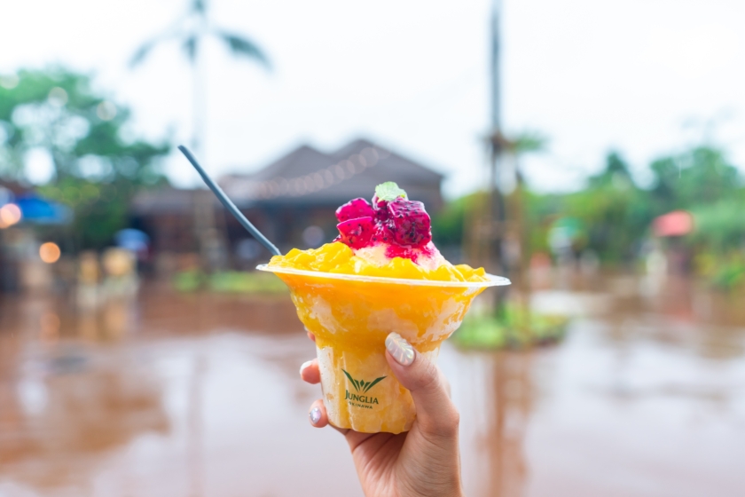 ちょうど雨も降ってきたので、パラソルベンチの下で雨宿りしながら「冷やしアジアンヌードル(税込1,200円)」と「トロピカル スノー アイス(税込1,300円)」をいただきました!仲の良い友達同士で行くと、フードをシェアして色々食べれるのも嬉しいですよねっ♪