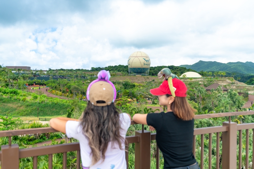 エントランスからSAFARI AREAに向かう途中、右側に気球が見えるスポット!気球に描かれた「JUNGLIA OKINAWA」のロゴがちょうどキレイに見えて、オススメのフォトスポットです♡