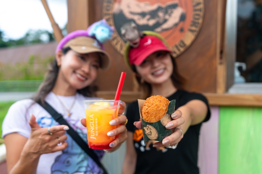 トロッとした卵の黄身とキーマカレーが入った、恐竜のたまごのようなまん丸カレーパン、食べ応えがあって美味しかったです!沖縄県産パイナップルがトッピングされた「サンライズドリンク」は、ザクロシロップとオレンジジュースのグラデーションが見た目も美しい!甘酸っぱくて、暑いパークにピッタリのビタミンチャージドリンクでした!