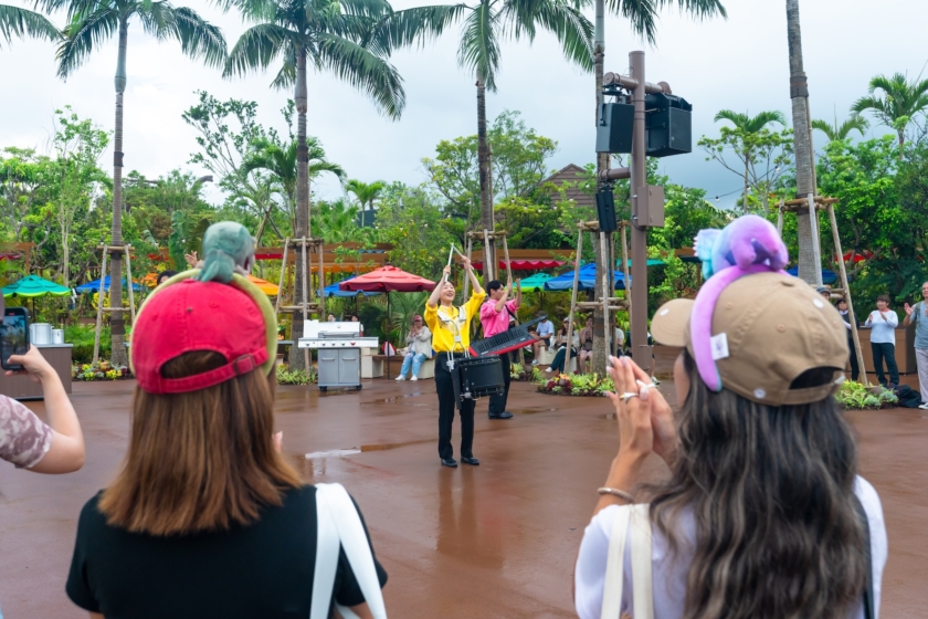 そこは熱帯植物に囲まれたアウトドアレストラン「ワイルド バンケット」!ちょうどライブが始まったようで、楽器を持った エンターテイナーさんたちが楽しそうにビートを奏でていました♪