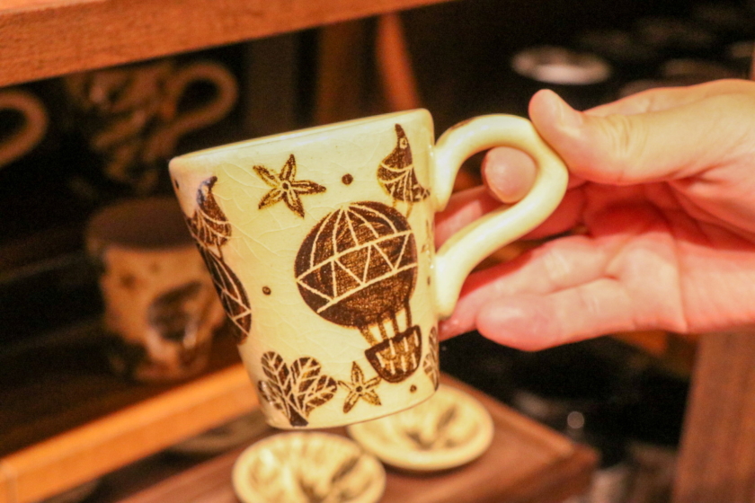 気球のアトラクション「HORIZON BALLOON」が描かれたデザインの、やちむんマグカップ。