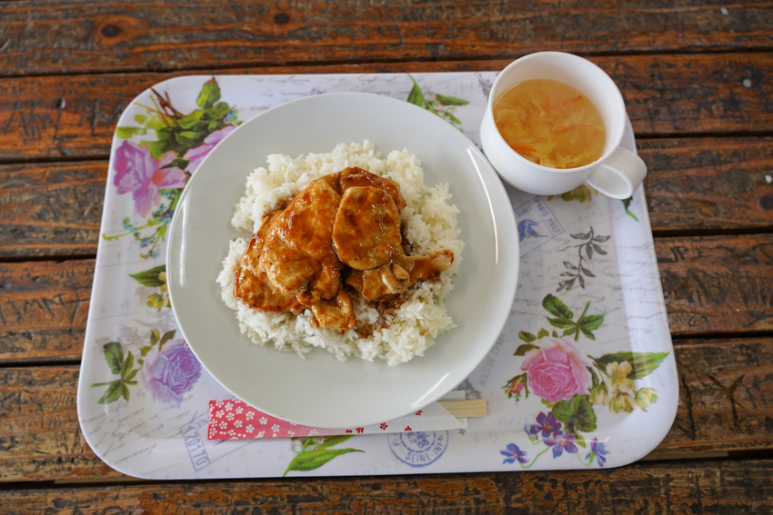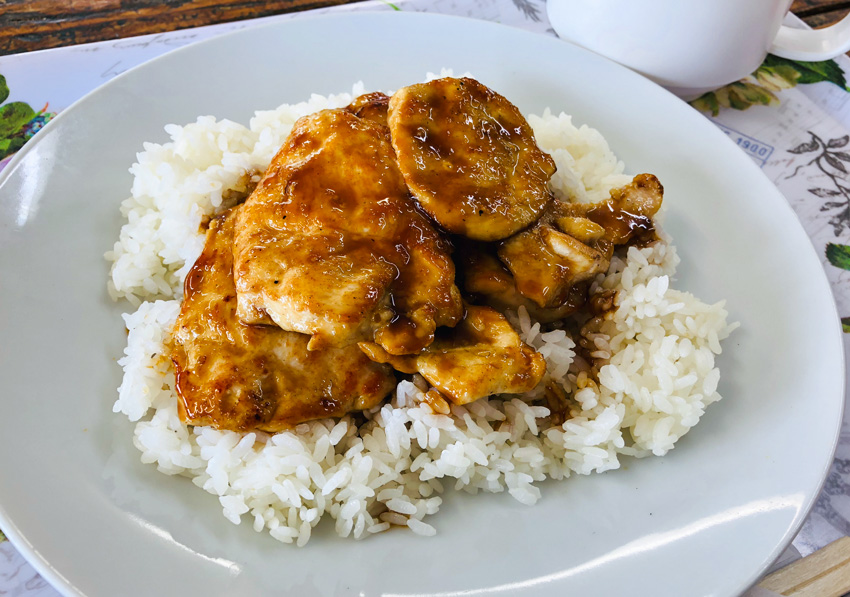 ヤキトリと同じ類のたれで味つけられた薄めの鶏肉がライスの上にドカーンと乗ったもの。