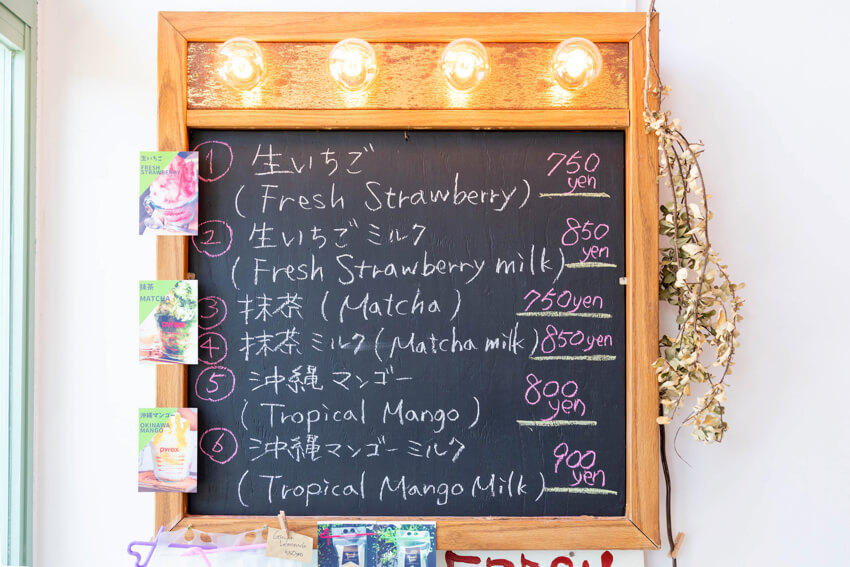 上面是新鮮的草莓、草莓煉乳、抹茶、抹茶牛奶、沖繩芒果、沖繩芒果牛奶共6種口味。