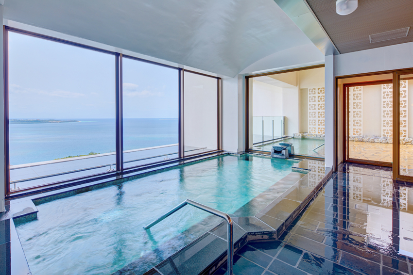 一邊在浴場裡泡澡一邊從最高層眺望美麗海景色………!!