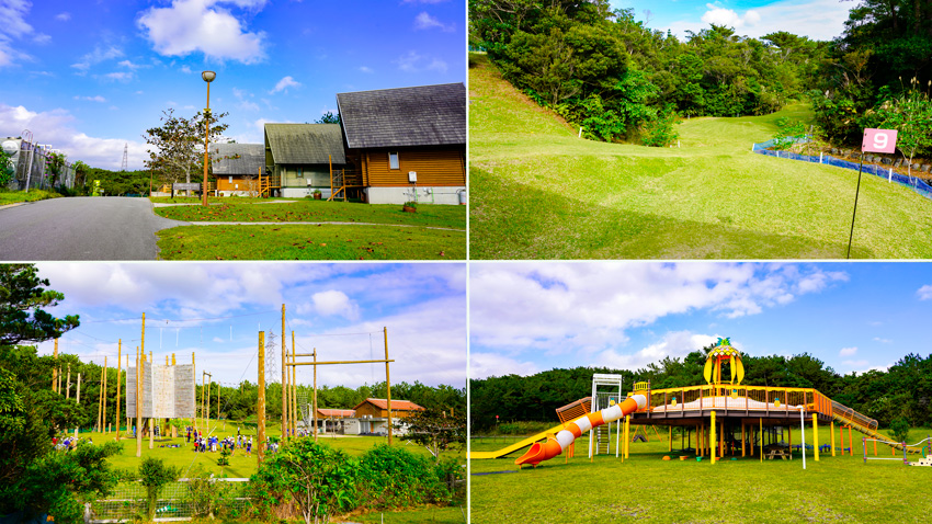 除了露營場地,也有小木屋和能與孩子同樂的休閒高爾夫球場、攀岩場,及其他由木板、木架組成的體驗教育設施(PA設施)等。
