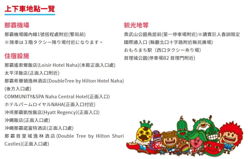 可於那霸機場、那霸市9間飯店與3處觀光景點乘車。