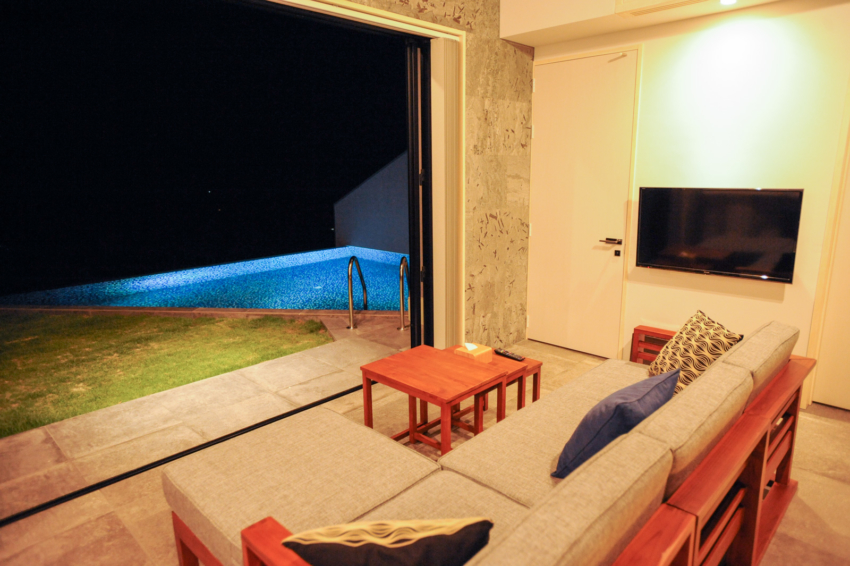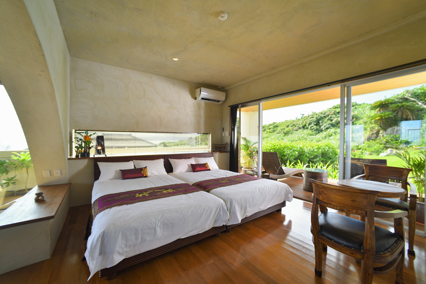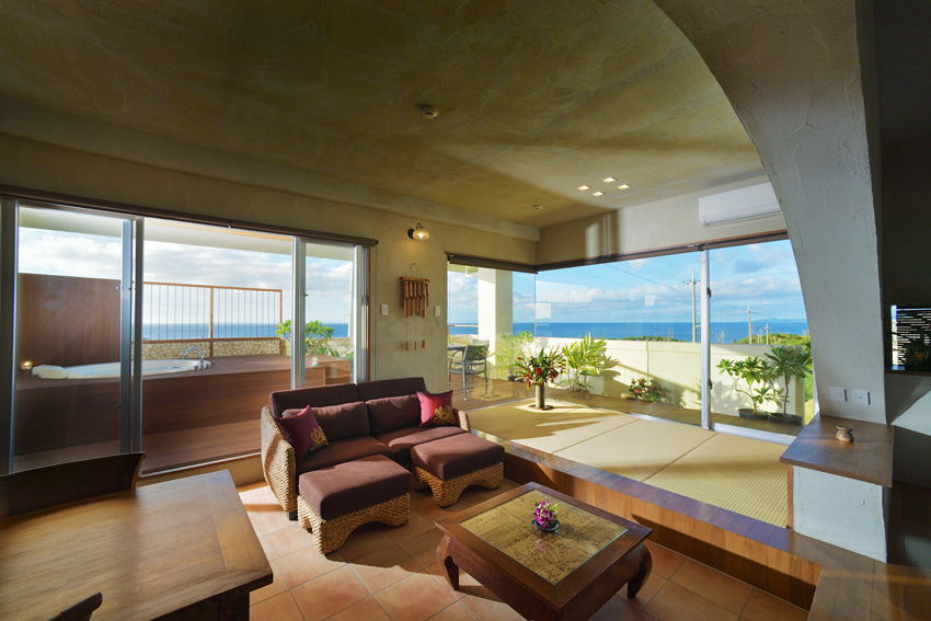 室內為琉球灰泥粉刷多為自然的素材,家具和室内擺設為以「亞洲中的沖繩」為印象的主題,設計成東方的氣氛是個讓人療癒的空間。