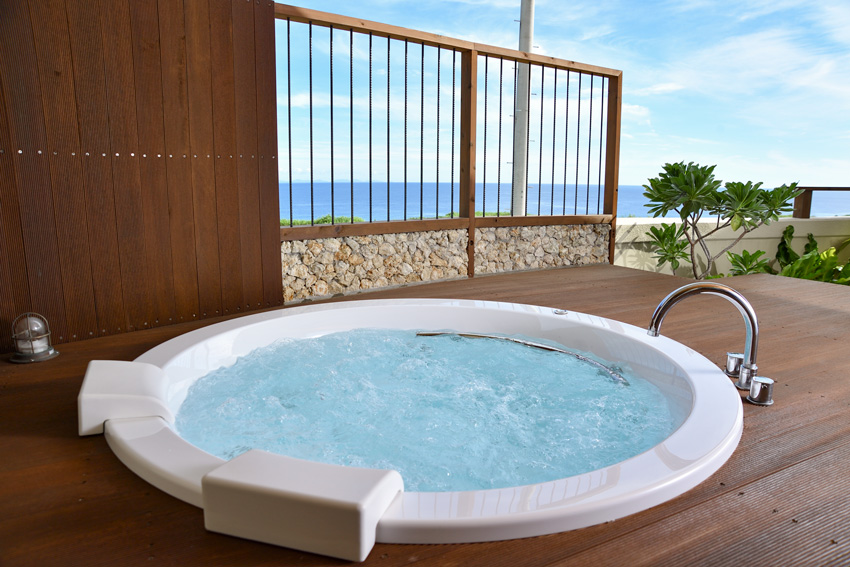 面海的露臺有海景的按摩浴缸,靠山的露臺準備了躺椅。