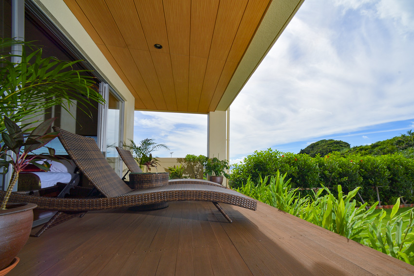 由露臺可以瞭望古宇利島人氣的能量景點「心型岩」,也可以看到夕陽西下的美景。