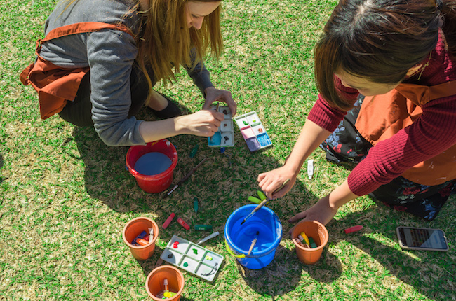 體驗活動預約後,請前往水上樂園區內的「章魚樹站」。在此處將發給您圍裙、筆(1枝)、顏料6色和畫具。