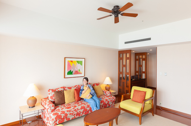 一進去房間映入眼簾的就是….. 讓人少女心萌發的可愛花紋的沙發〜♡ 「請您隨意坐坐〜!」沖繩南海灘度假飯店好意的招待….. 那就不客氣的坐了下來♪ 笑