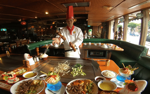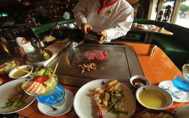 每個座位都有附鐵板,因此可以在每個人的座位前表演現煎牛排喔(╹◡╹)< ALOHAー )
