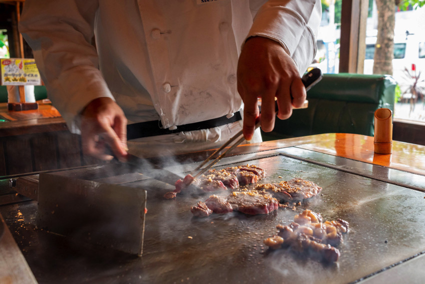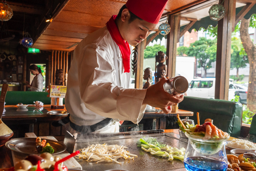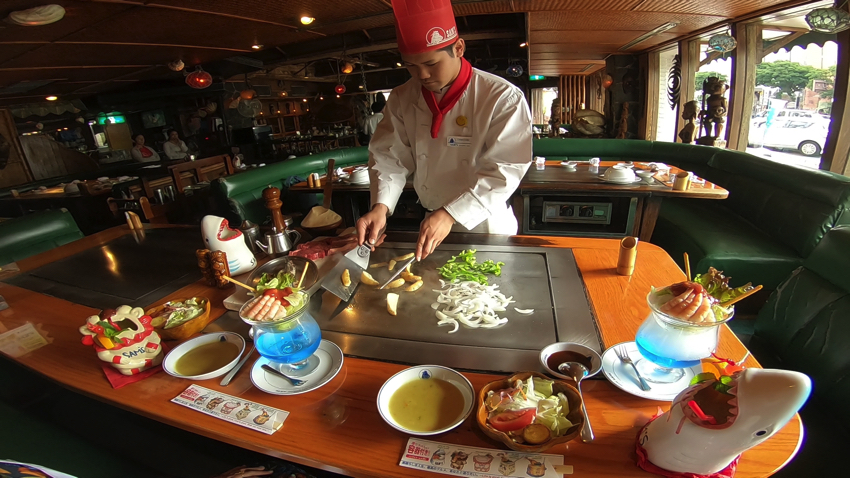 每個餐桌前都放著鐵板,然後主廚站在您的面前料理您的食材,這是SAM’S MAUI 久茂地店的魅力。(╹◡╹)