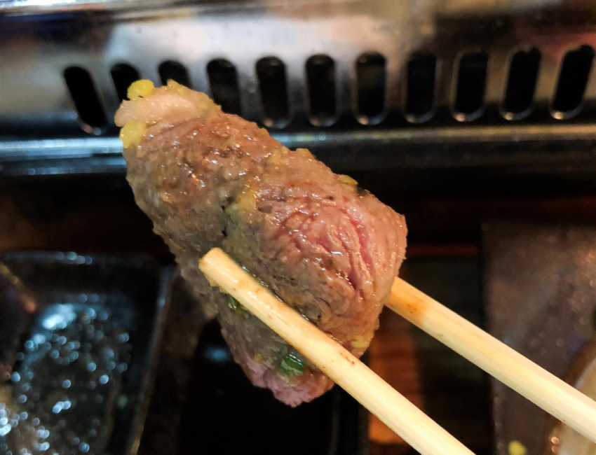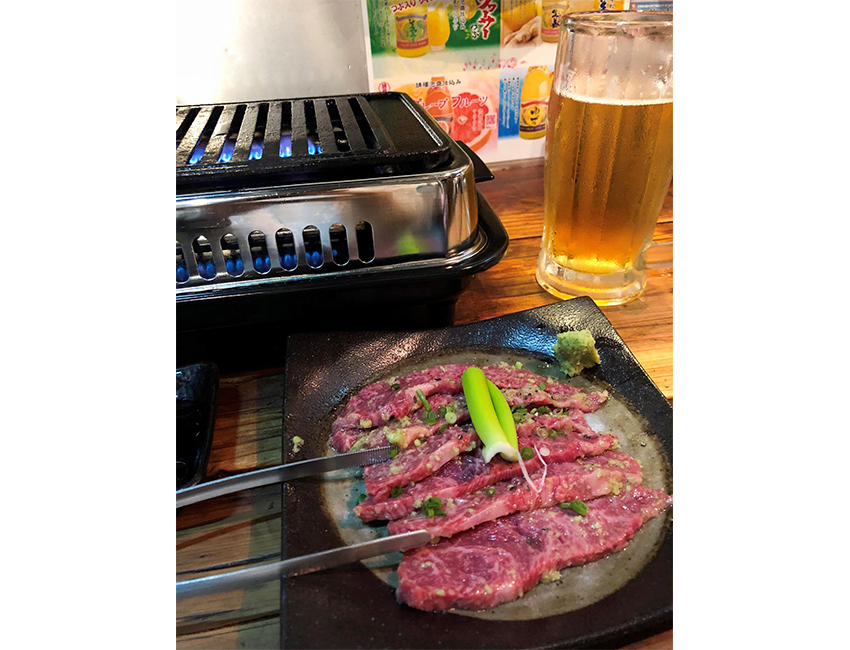 烤得剛剛好的霜降看起來好美,邊烤邊喝一口啤酒。