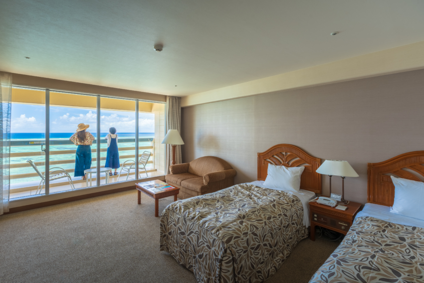 從陽台可以看見藍色閃閃動人的海景,設施內的本部元氣村(之後會介紹!)可以看見飛躍的海豚畫面喔♪