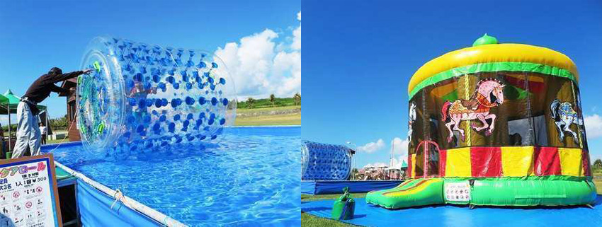 可以在水咕魯咕魯轉動的「Aqua Roll」(照片・左)還有似旋轉木的水上遊樂器材「漂漂旋轉木馬」(照片・右)非常受小朋友歡迎◎