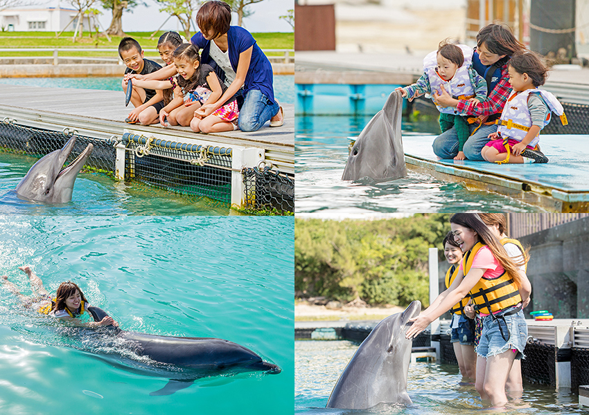 美麗海水族館每天都有的海豚秀看完的隔一天,實際上在本部元氣村裡時計的可以接觸海豚,這樣令人心跳加速的行程如何呢?