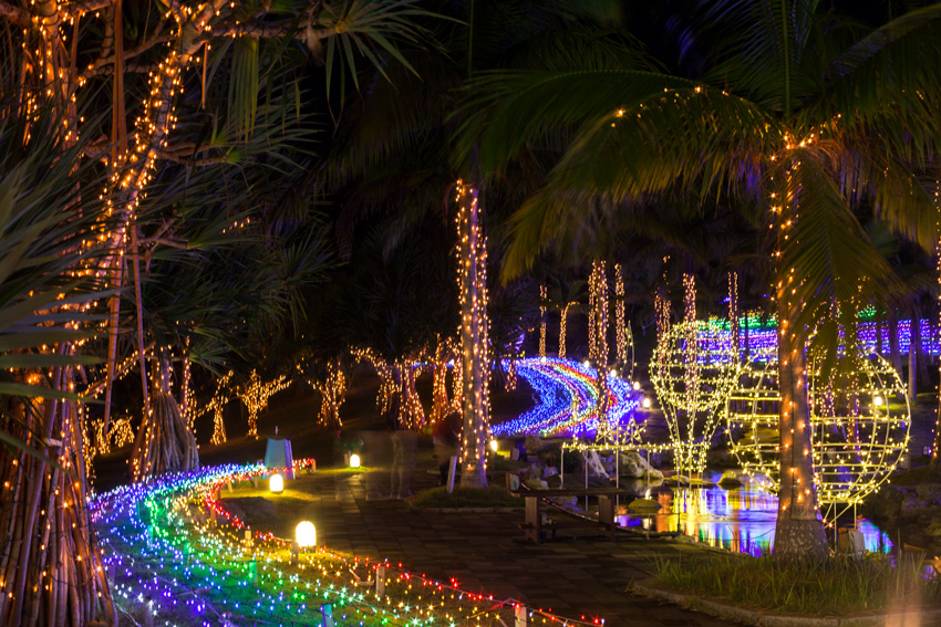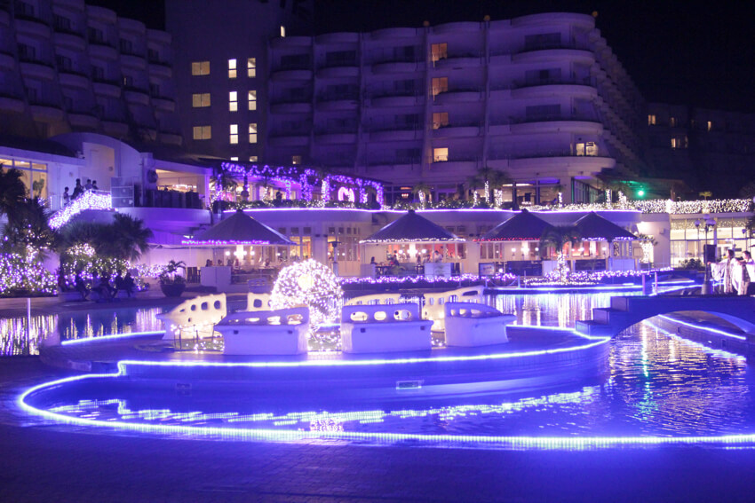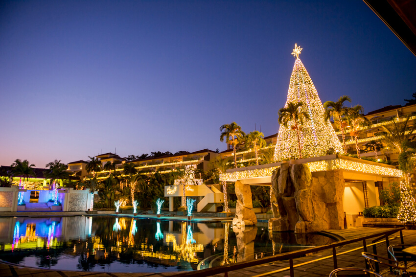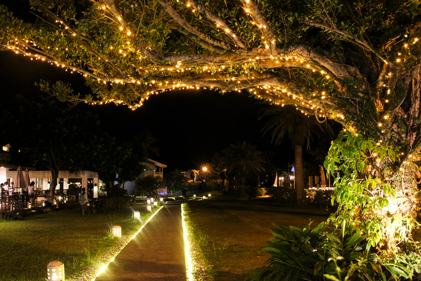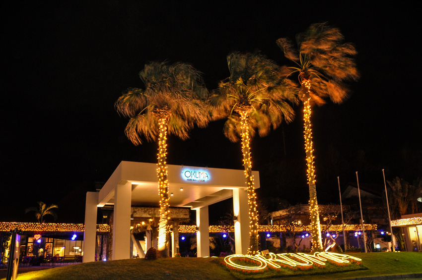 點亮奧間夜晚的燈飾以飯店前廣場為中心,在渡假村各處的萬年青都被燈飾裝飾得非常華麗。