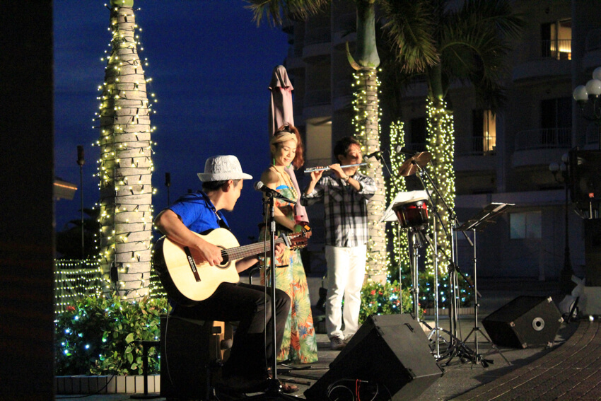 點燈期間再游泳池畔還有充滿南國氛圍的現場音樂會「百萬夢幻節音樂會」可以盡情享受渡假時光。