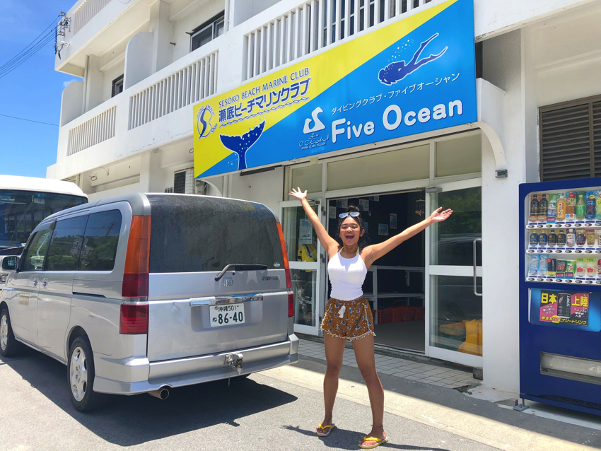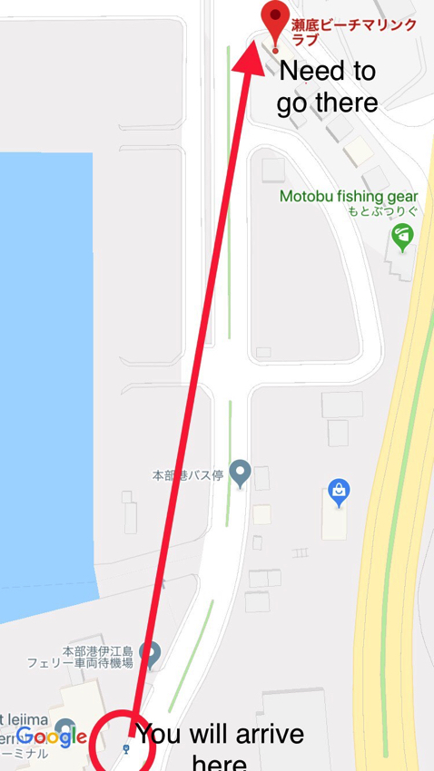 The bus will take drop you off to Motobu port, if you just keep walking up hill (7-10 minute walk) you will hit the big white building at the end of the road and it is the Sesoko Beach Marine Club.