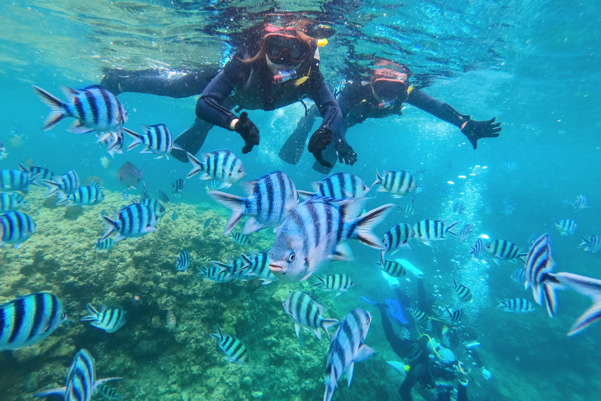 If you think like “I want to swim in the Blue Caves because during snorkeling I can feel the blue color better that if I go diving”, we recommend to apply for snorkeling♪