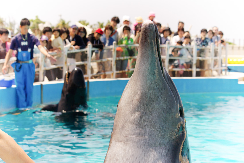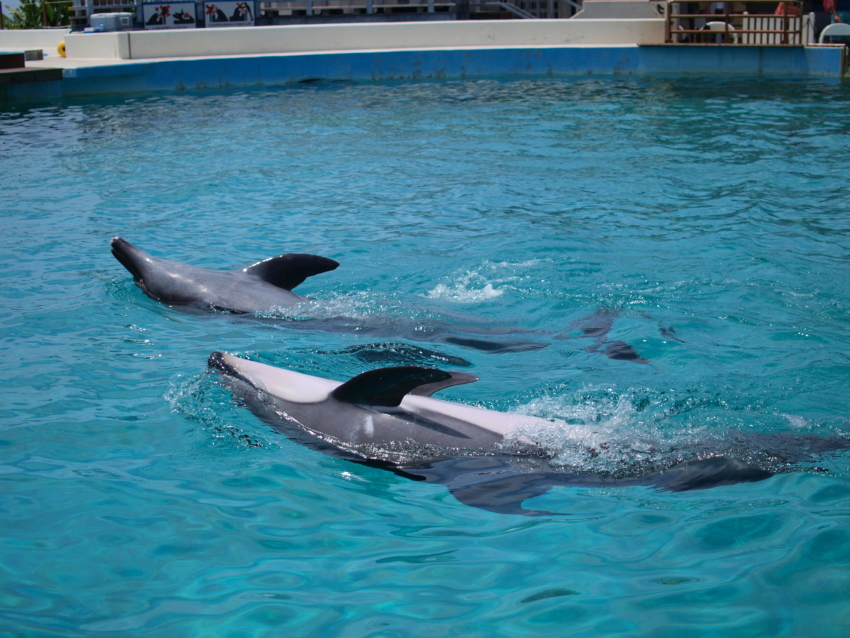 Right next to the Oki-chan Theater is the ‘Dolphin Lagoon.’ Here you can not only view dolphins up close, but you can also feed them for only one coin ♪