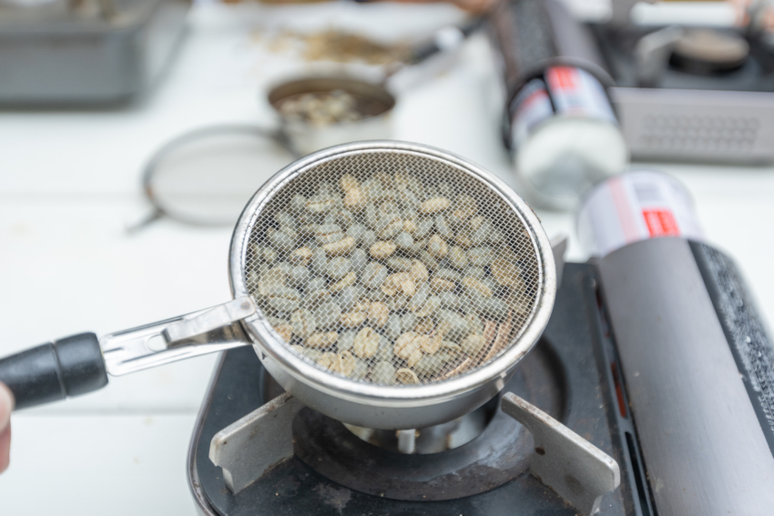 파치먼트(커피열매의 껍질)를 정미기로 제거한 후, 커피콩만 핸디 로스터에 담아 볶는다.☆