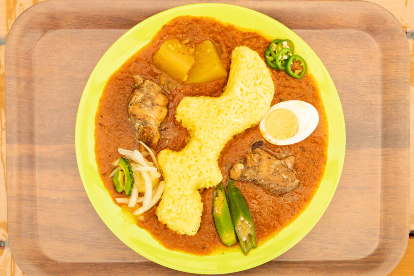 오키나와의 모양을 한 울금(우콘) 라이스 주위에는 고야 무침과 돼지고기, 동과(겨울오이), 오쿠라, 치킨, EM 달걀이 토핑되어 있습니다.
