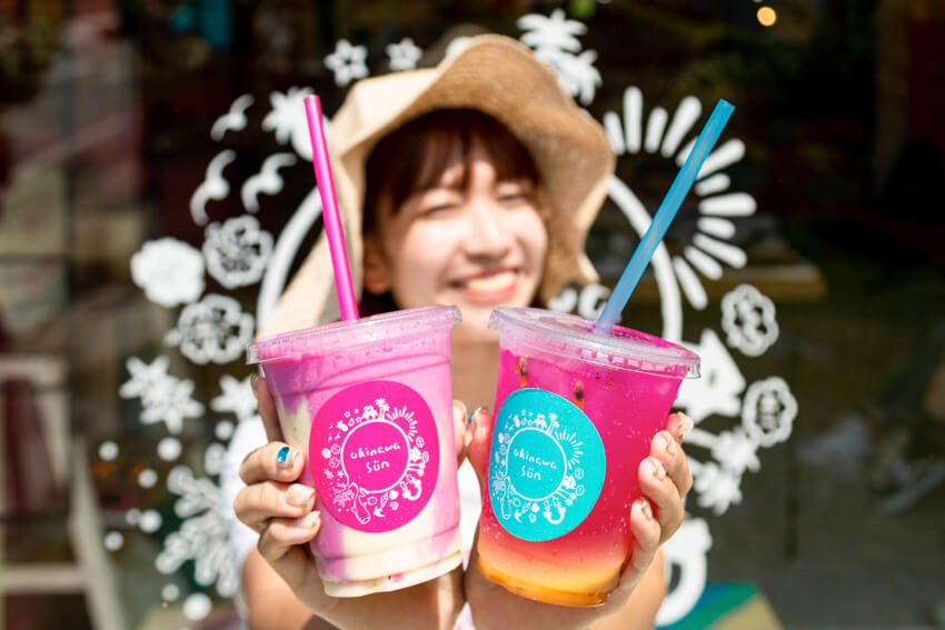 ▼오키나와산 과일로 만든 주스를 마실 수 있어요