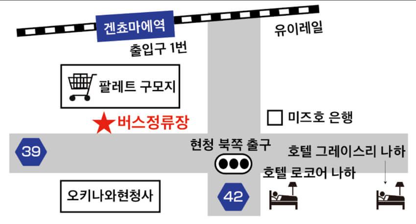 유이레일 겐쵸마에역에서 도보로 약 3분. 국제거리 입구에 있는「미즈호 은행 나하지점」에서 도보 약 1분.
