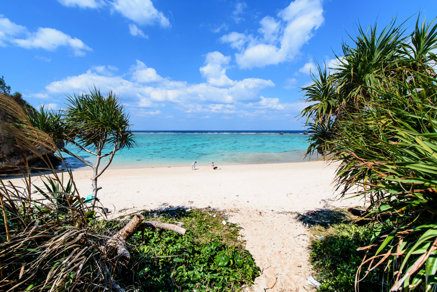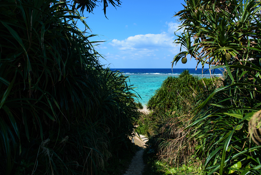 아단 나무(Screw pine) 등 오키나와의 초목이 무성한 계단을 내려오면 눈부신 푸른 바다가 펼쳐져 있고