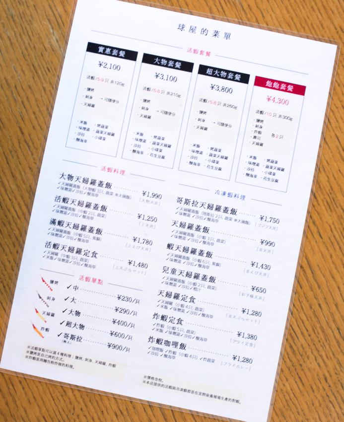 Goma:7月~9月提供的是由冷冻车虾做成的天妇罗盖饭·炸虾天妇罗盖饭·哥斯拉天妇罗盖饭·哥斯拉天妇罗套餐·儿童天妇罗盖饭·天妇罗套餐·炸虾定食·炸虾咖喱饭等8种菜品。
